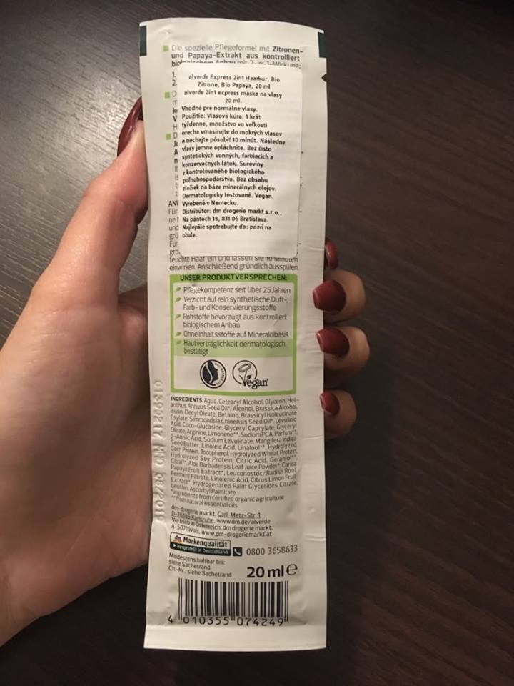 Ale späť k maske,keďže pri minulom testovaní som bola so značkou Alverde spokojná,rozhodla som sa ich kvalitu opäť vyskúšať.Väčšia produktov tejto dm značky je bio a vegan,čo je podľa mňa veľké plus.